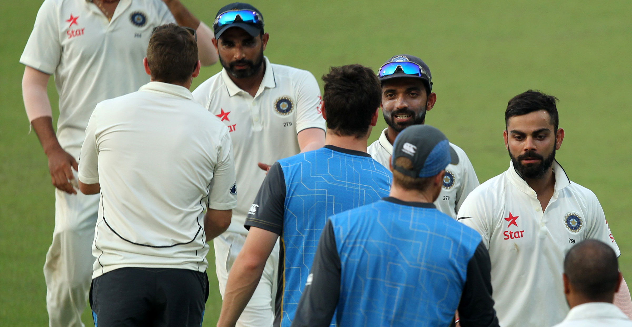 However, wickets would fall periodically throughout the afternoon, with Ravi Ashwin, Mohammad Shami and Ravindra Jadeja claiming three wickets a piece to eventually dismiss the BLACKCAPS for 197.