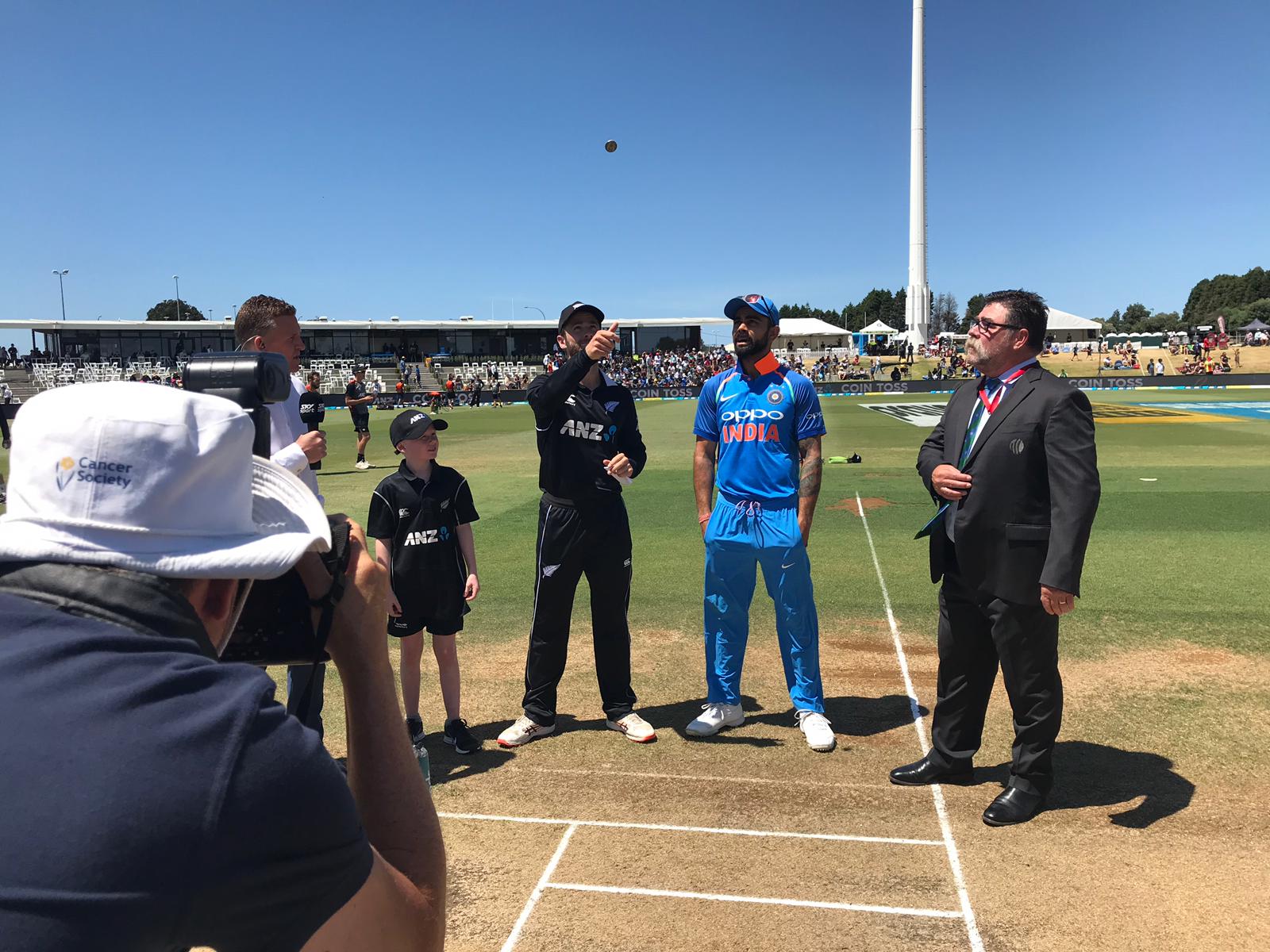 Kane Williamson has won the toss and opted to bat first here at @BayOvalOfficial. Mitchell Santner comes into the XI for Colin de Grandhomme. #NZvIND pic.twitter.com/5ZS9rrr1Wf