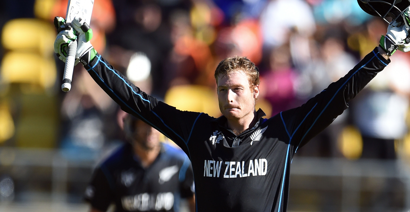 Guptill brought up his seventh ODI century off 111 balls with an on drive and raised his bat to a raucous reception from the Wellington faithful, becoming the first New Zealander to strike consecutive centuries in a World Cup.