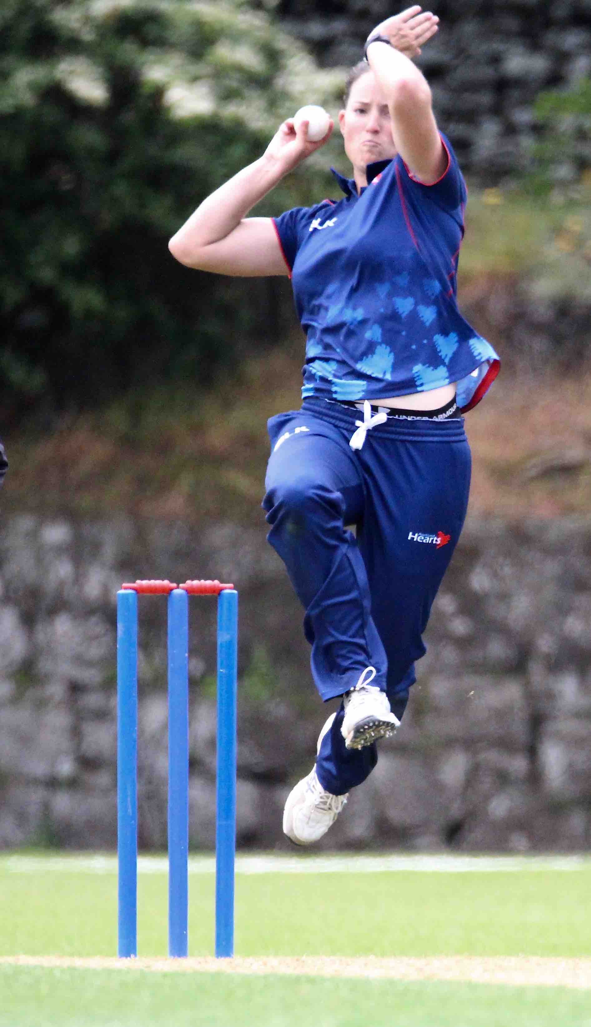 WHITE FERN Holly Huddleston (4-44, below, PHOTOSPORT) did the damage with the ball before fellow WHITE FERNS Anna Peterson (a run-a-ball 54 at the top), Hearts captain Maddy Green (37 off 46) and Katie Perkins - who will play her own 100th match tomorrow (62* off 74) ensured the hosts clinched victory with 11.3 overs to spare.