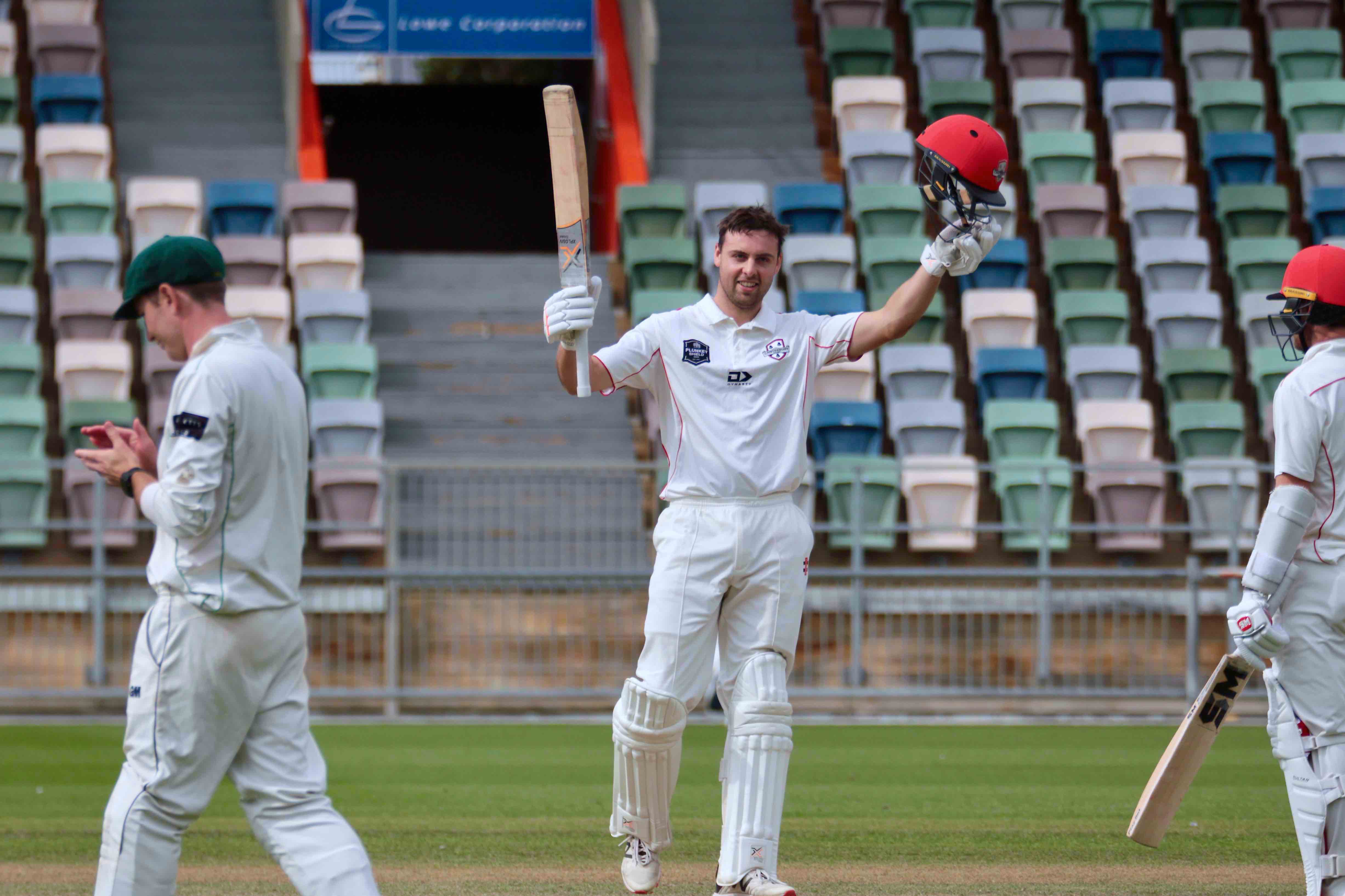 After a night on 93* in just his second Plunket Shield appearance, Canterbury's Harry Chamberlain patiently kept his teammate on tenterhooks for more than an hour of the third morning before reaching his maiden first-class century - off 218 balls, in 303 minutes (15x4, 1x6).