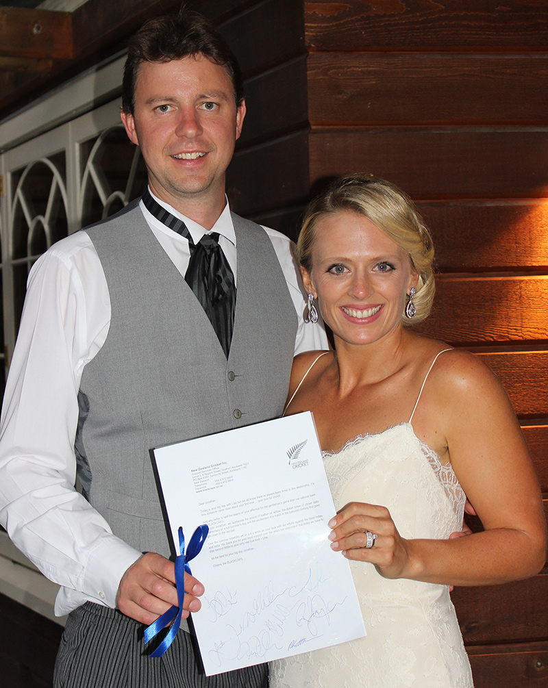 When keen cricket fan Jonathan Wood got married, his wife-to-be Lisa secretly arranged a special surprise letter from the BLACKCAPS to open on the big day. She writes: