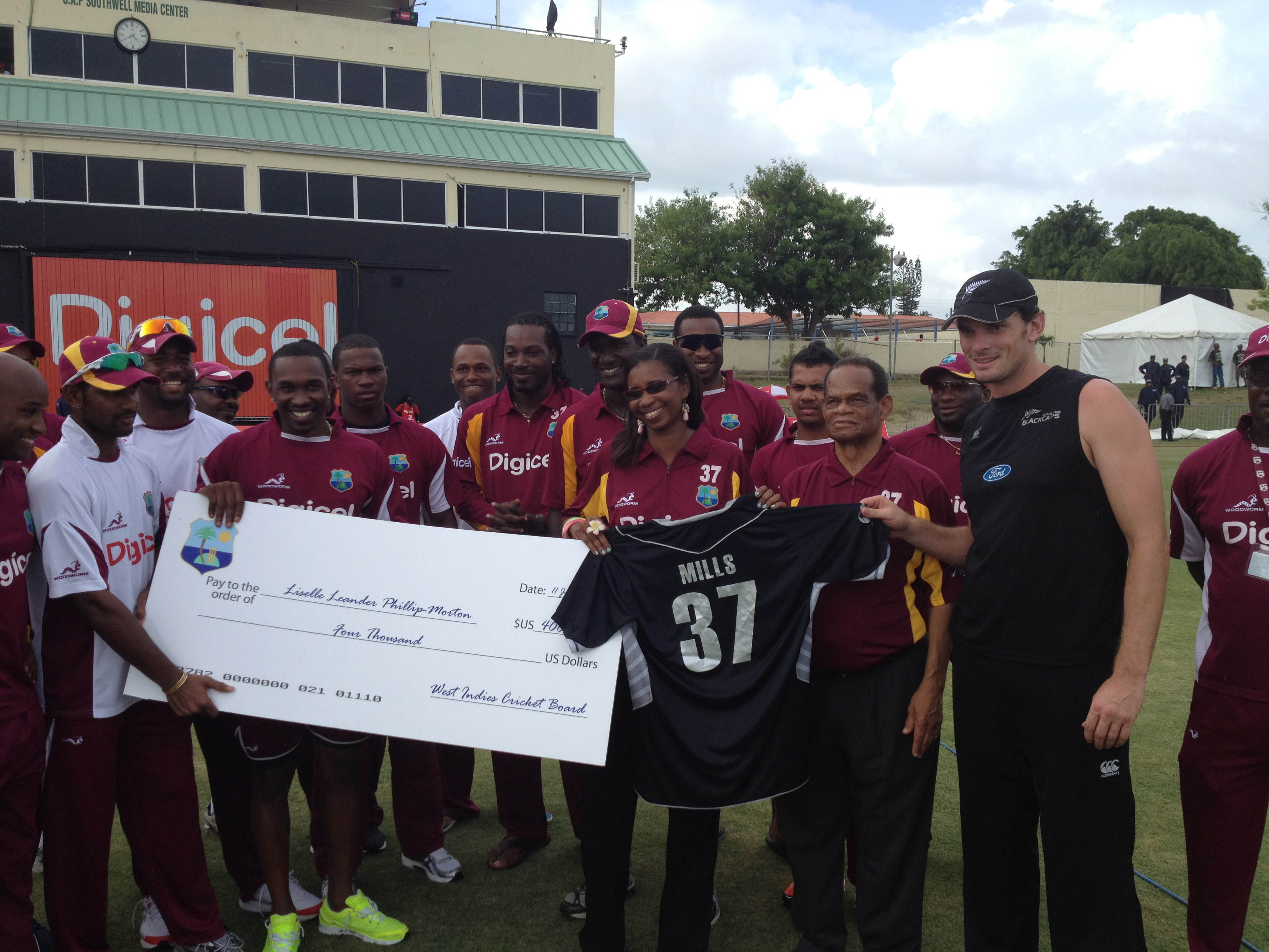 Kyle Mills presented his number 37 playing jersey to the family of Runako Morton, on behalf the BLACKCAPS, to honour the former West Indian cricketer who passed away earlier this year.