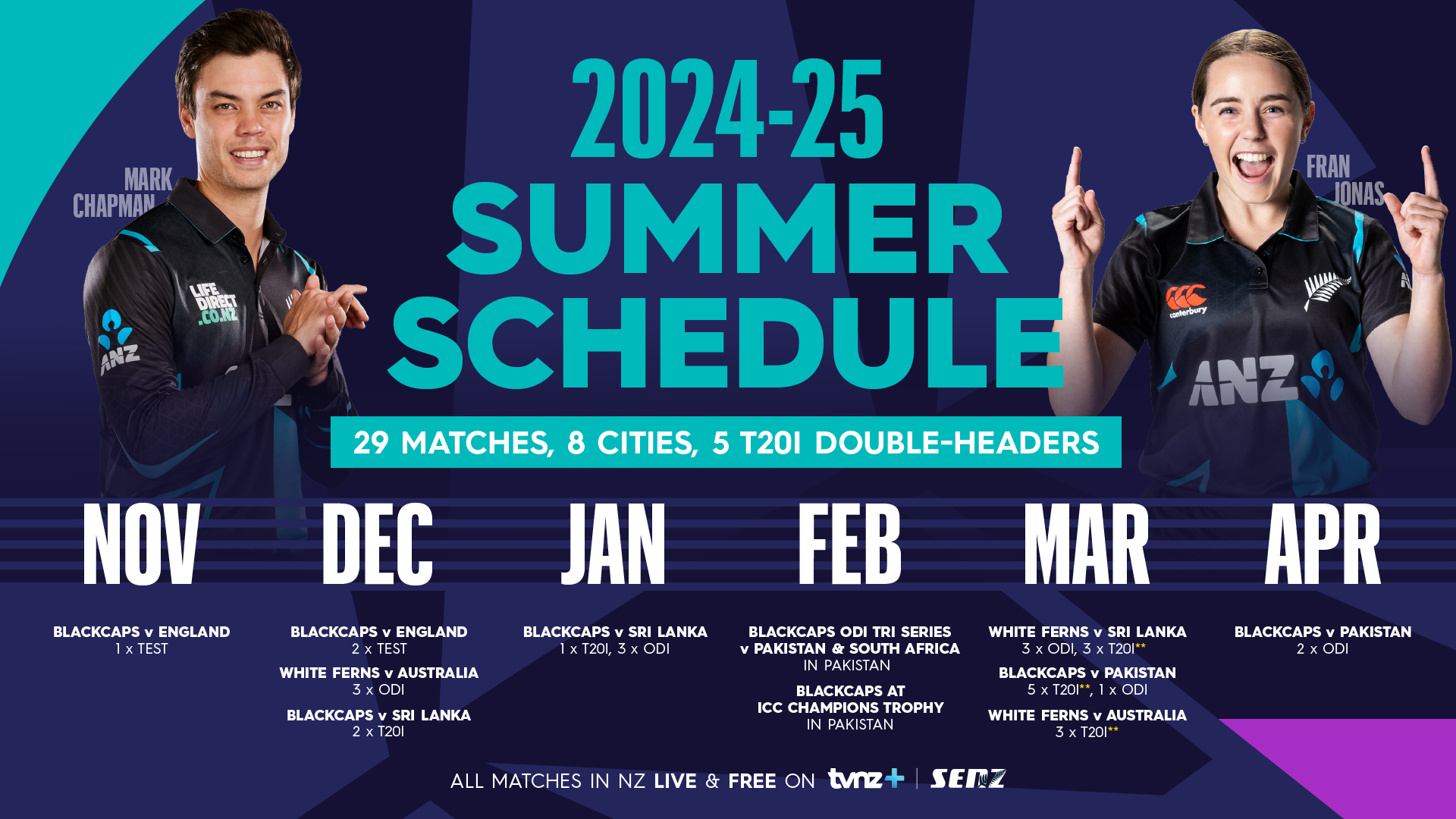 The programme starts with the BLACKCAPS’ much-anticipated three match Test series against England before Christmas, ends with the WHITE FERNS hosting Australia’s T20I side in late March, and in between includes visits from the Australia women’s ODI team, Sri Lanka men and women, and the Pakistan men’s side - potentially 41 days of international cricket in eight different cities, all of which will be broadcast free-to-air and live on TVNZ 1, TVNZ DUKE and TVNZ+.