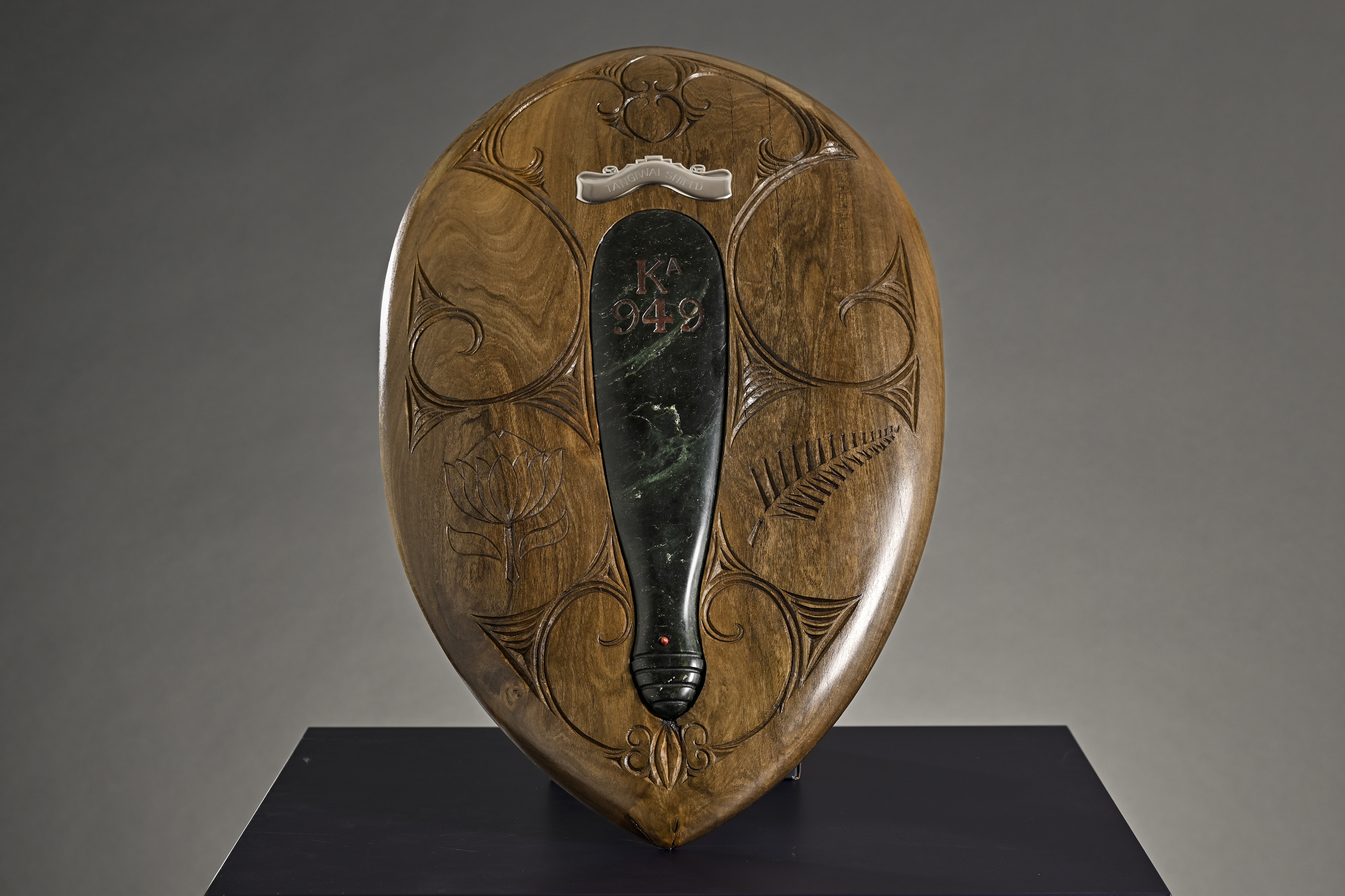 The Shield, created by carver David Ngawati (Ngāti Hine), is made from New Zealand native timber puriri, and includes an inlaid mere made from pounamu sourced from the Tangiwai region.